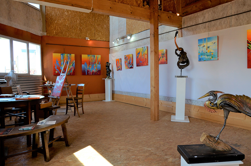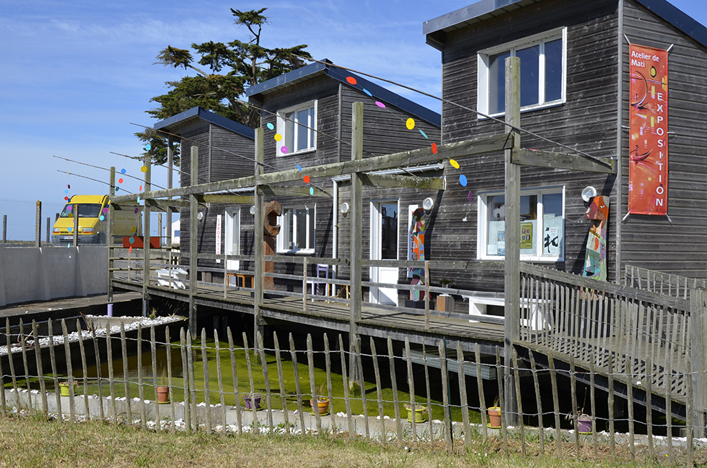 Entre les pêcheries et les ostréiculteurs du port des Moutiers en Retz, son atelier galerie s’arrime sur pilotis, dans l’enclave de la Baie de Bourgneuf, embobelinée dans la lumière capricante des vents et marées atlantiques.